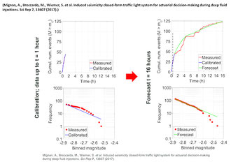 The figure shows a procedure developed by ETH Zurich for predicting seismicity during hydraulic stimulations. The method was successfully used In the Bedretto Laboratory of ETH Zurich in November and December 2020 as part of the demonstration project for the multi-stage stimulation concept of Geo-Energie Suisse AG.