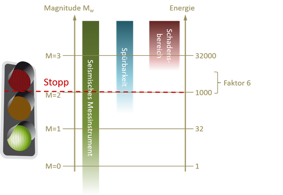 Die Messstationen ermöglichen die Echtzeitbeobachtung und -überwachung insbesondere der nicht wahrnehmbaren induzierten Seismizität in der Tiefe. Das Messsystem ist mit einer Ampelsteuerung verbunden. Die einzelnen Grenzwerte beinhalten immer auch einen Sicherheitspuffer. Bereits bei einer weit unter dem Schadensbereich liegenden Magnitude von 2.0 springt die Ampel auf Rot und die Arbeiten am Projekt werden vorläufig gestoppt (Bildquelle: Q-con).